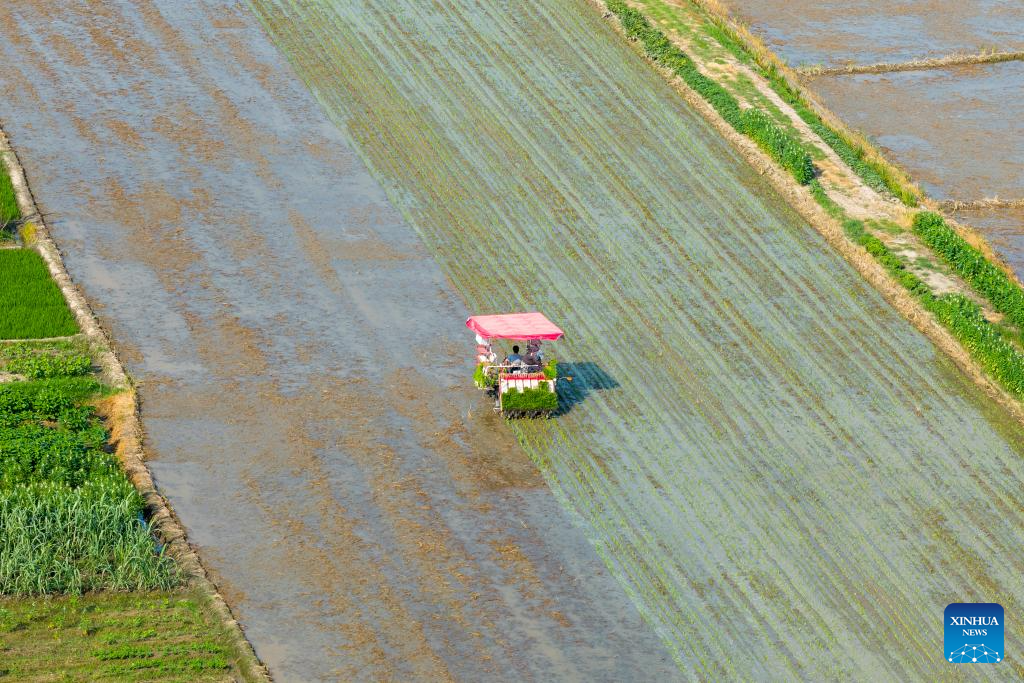 An aerial drone photo taken on July 15, 2025 shows villagers operating a farming machinery transplanting late rice in Hengshan County of Hengyang City, central China's Hunan Province. (Photo by Cao Zhengping/Xinhua)