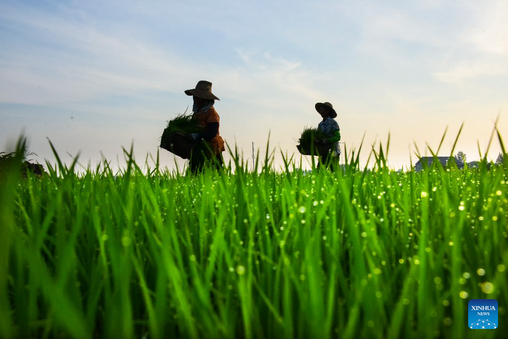 Villagers transport rice seedlings in a late rice paddy field in Lixian County of Changde City, central China's Hunan Province, July 15, 2025. (Photo by Bai Yipu/Xinhua)
