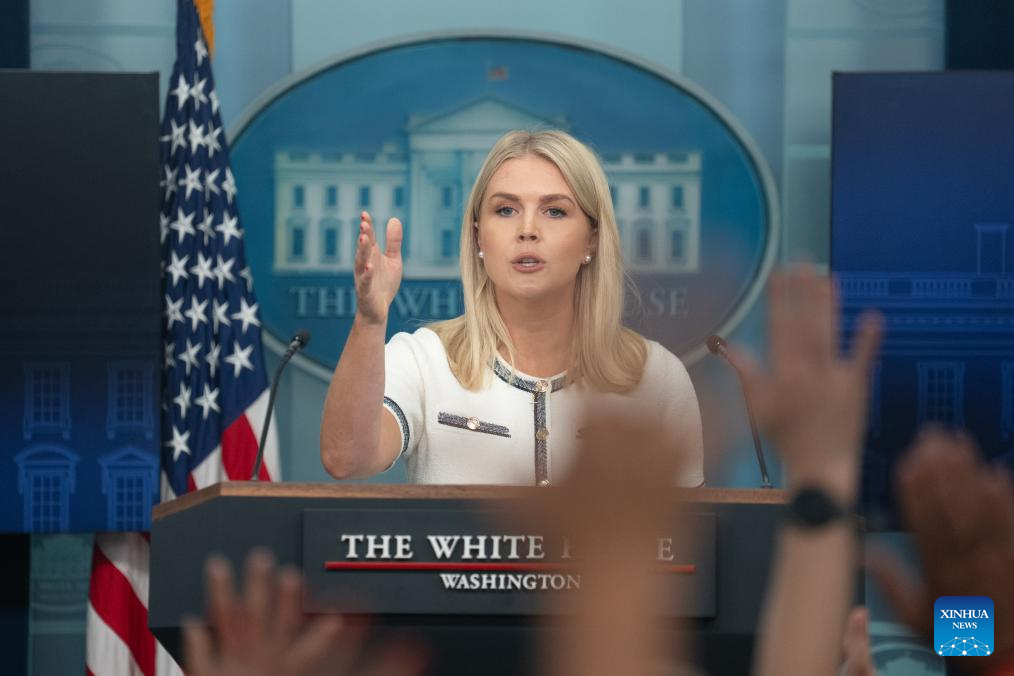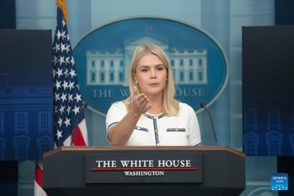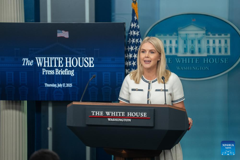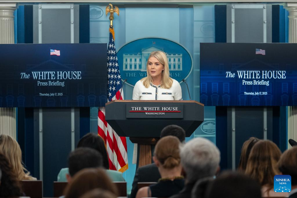 White House Press Secretary Karoline Leavitt speaks during a press briefing at the White House in Washington, D.C., the United States, on July 17, 2025. U.S. President Donald Trump has been diagnosed with a common and benign vein condition after experiencing swelling in his lower legs, White House Press Secretary Karoline Leavitt announced on Thursday. (Xinhua/Hu Yousong)