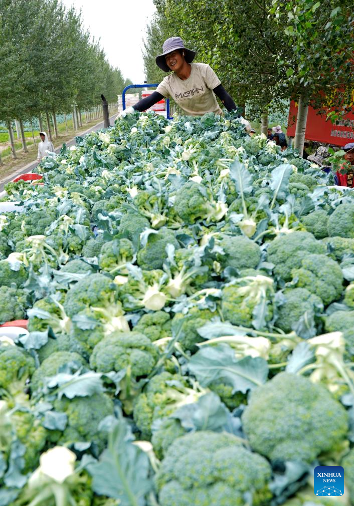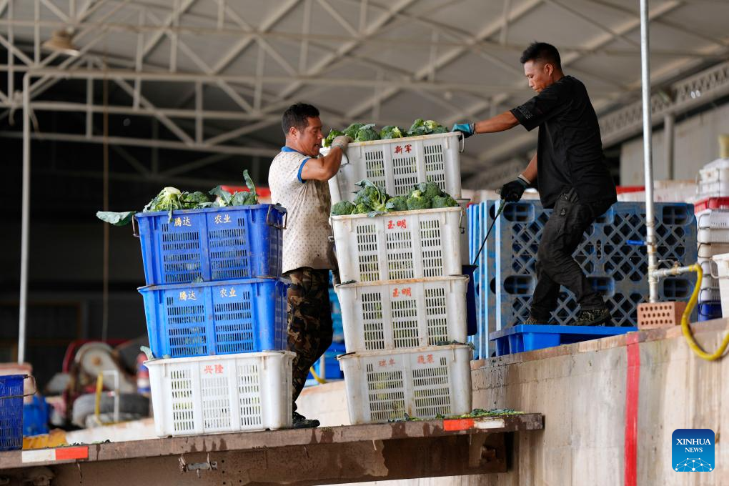 Staff members transport broccoli at a cool-season vegetable base in Guyuan, northwest China's Ningxia Hui Autonomous Region, July 18, 2025. Leveraging its high-altitude terrain and cold-weather advantages, Guyuan has vigorously developed its cool-season vegetable industry in recent years. (Xinhua/Wang Peng)