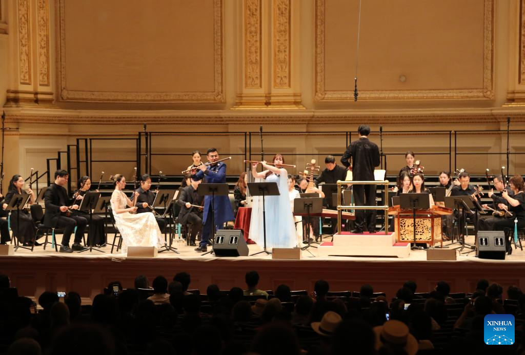 Dizi players (front) perform at the Sixth New York Big Apple Music Festival in New York, the United States, on July 19, 2025. (Xinhua/Liu Yanan)