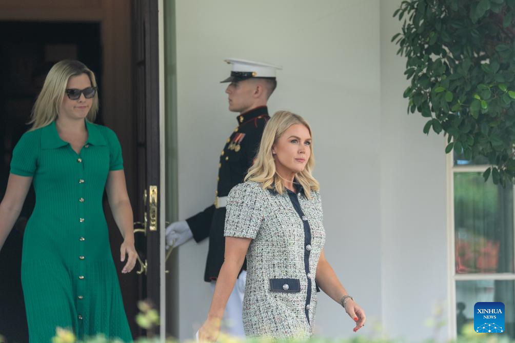 White House Press Secretary Karoline Leavitt (R) walks to speak with reporters at the White House in Washington, D.C., the United States, on July 21, 2025. Leavitt said on Monday that the Trump administration has revoked The Wall Street Journal's (WSJ) press pool credential for covering the president's upcoming trip to Scotland, U.S. media reported.