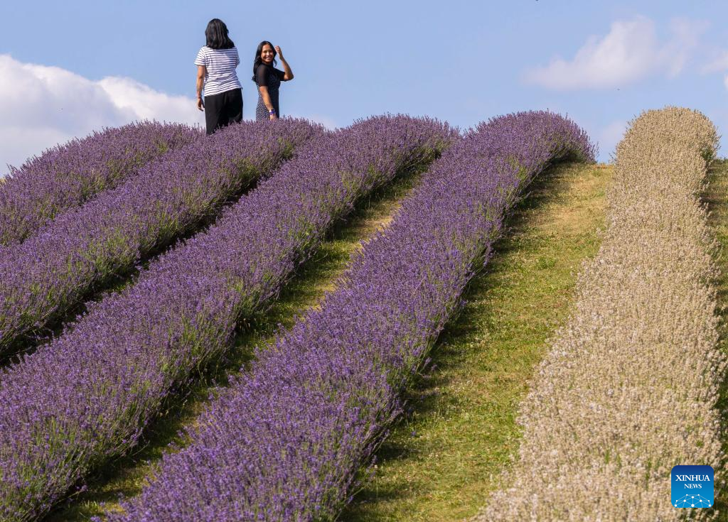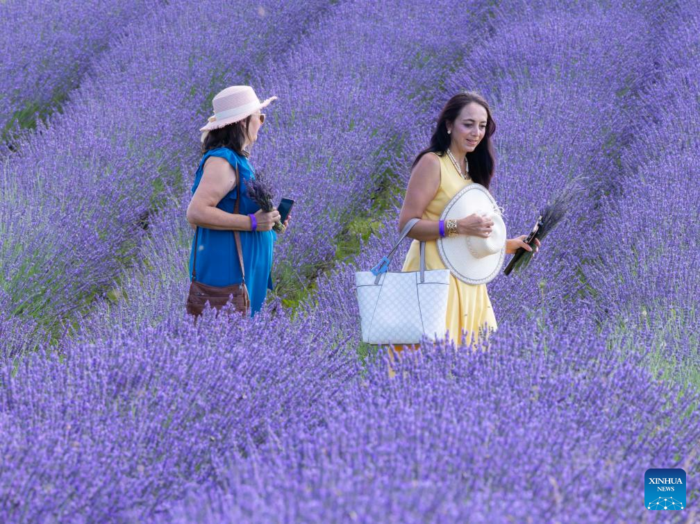 Visitors walk through a lavender field in Milton, Ontario, Canada, on July 22, 2025. (Photo by Zou Zheng/Xinhua)