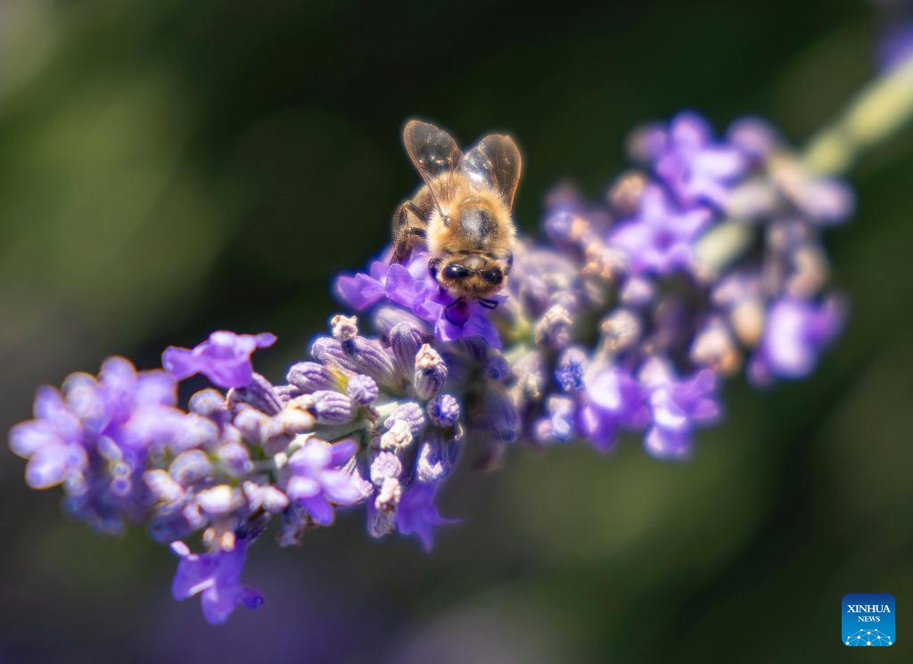A honey bee stays on lavender blossoms at a lavender field in Milton, Ontario, Canada, on July 22, 2025. (Photo by Zou Zheng/Xinhua)