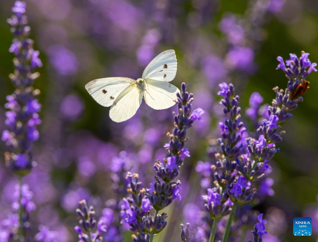 A cabbage butterfly flies among lavender blossoms at a lavender field in Milton, Ontario, Canada, on July 22, 2025. (Photo by Zou Zheng/Xinhua)