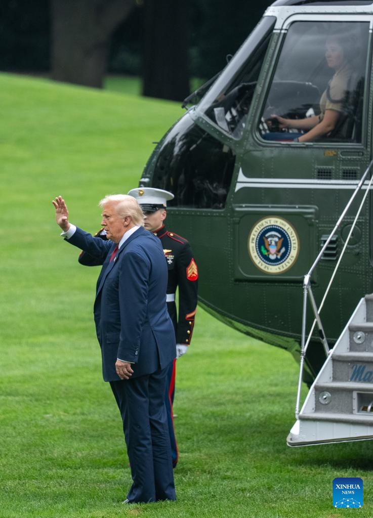 U.S. President Donald Trump waves before boarding Marine One at the White House in Washington, D.C., the United States, on Aug. 1, 2025. U.S. President Donald Trump on Friday announced that he has ordered the firing of Erika McEntarfer, commissioner of the Bureau of Labor Statistics (BLS), accusing her of manipulating data for political purposes. (Xinhua/Hu Yousong)