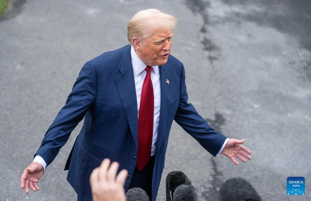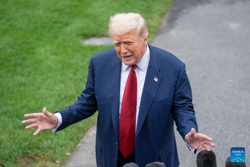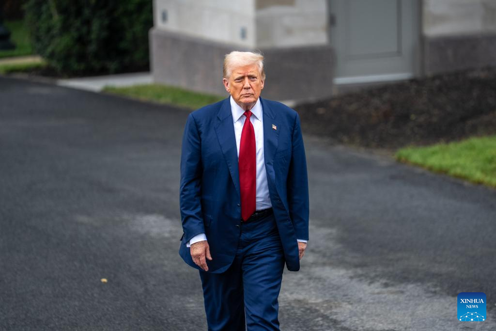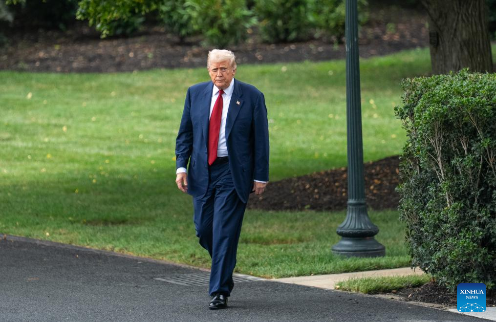 U.S. President Donald Trump walks to the South Lawn of the White House in Washington, D.C., the United States, on Aug. 1, 2025. U.S. President Donald Trump on Friday announced that he has ordered the firing of Erika McEntarfer, commissioner of the Bureau of Labor Statistics (BLS), accusing her of manipulating data for political purposes. (Xinhua/Hu Yousong)