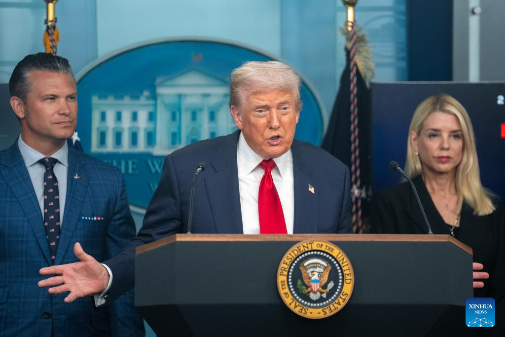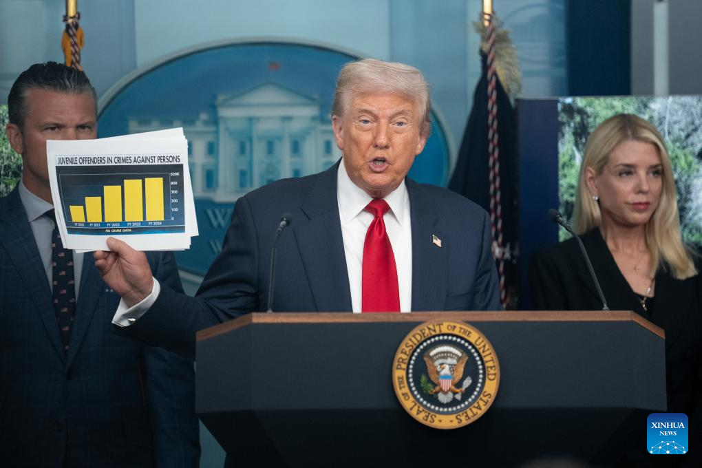 U.S. President Donald Trump (C) speaks during a press conference at the White House in Washington, D.C., the United States, on Aug. 11, 2025. Trump said at a White House press conference Monday that he is deploying the National Guard to assist in restoring law and order and public safety in Washington, D.C. (Xinhua/Hu Yousong)