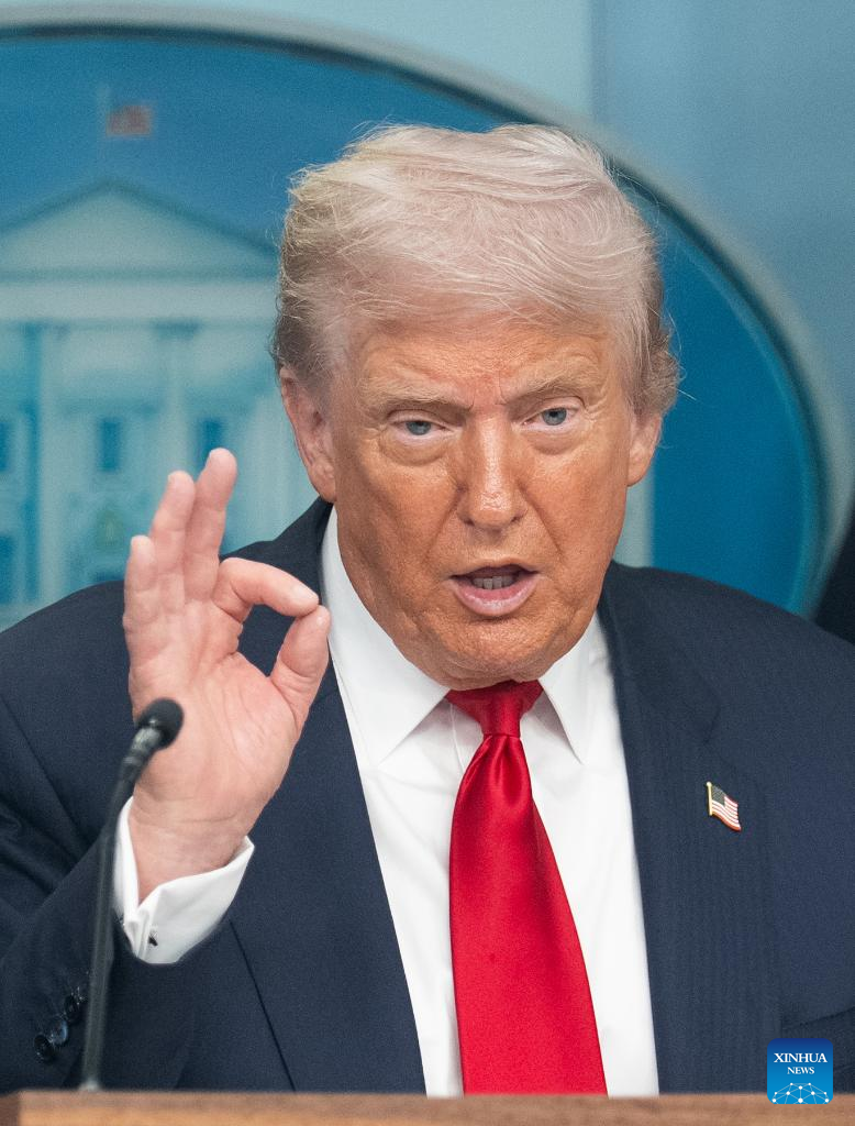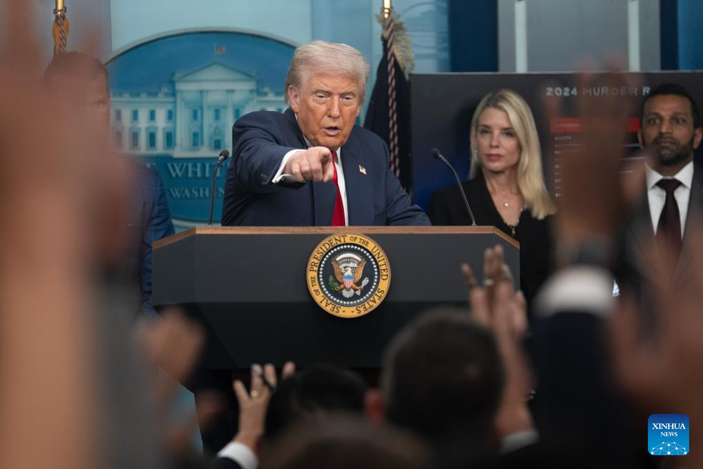 U.S. President Donald Trump takes questions during a press conference at the White House in Washington, D.C., the United States, on Aug. 11, 2025. Trump said at a White House press conference Monday that he is deploying the National Guard to assist in restoring law and order and public safety in Washington, D.C. (Xinhua/Hu Yousong)