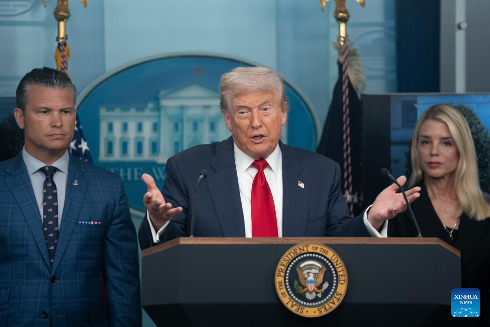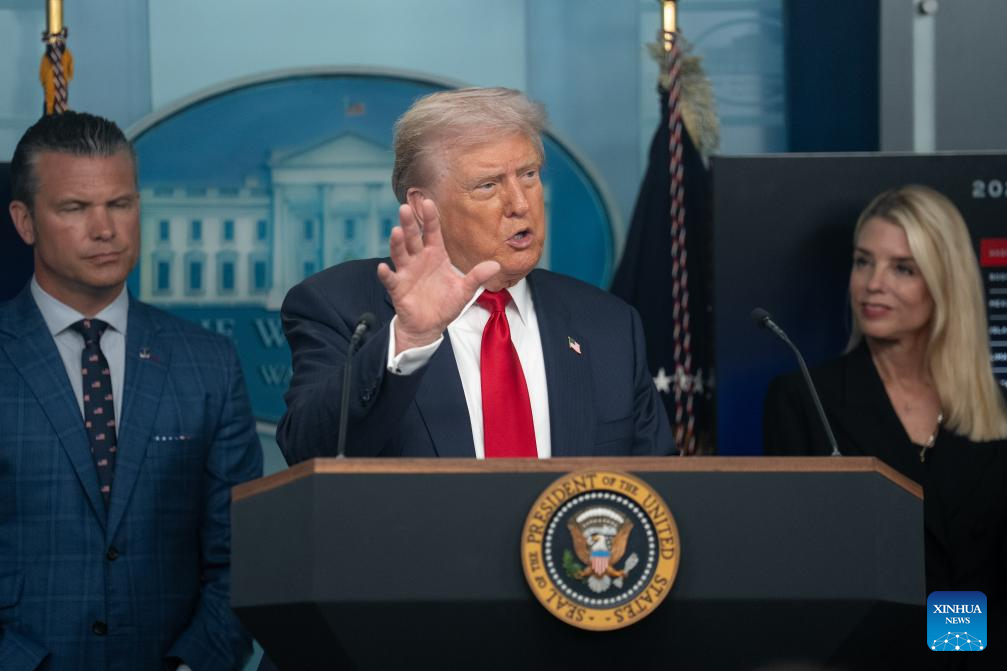 U.S. President Donald Trump speaks during a press conference at the White House in Washington, D.C., the United States, on Aug. 11, 2025. Trump said at a White House press conference Monday that he is deploying the National Guard to assist in restoring law and order and public safety in Washington, D.C. (Xinhua/Hu Yousong)