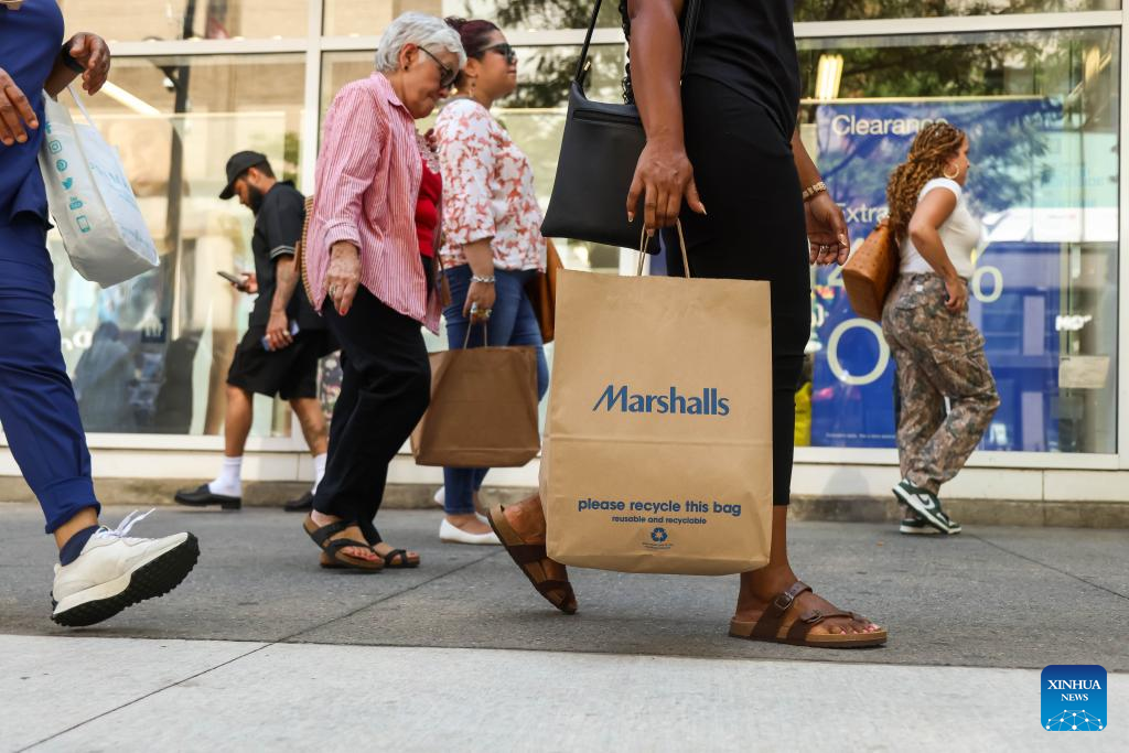 People walk past the street with shopping bags in New York, the United States, on Aug. 12, 2025. The U.S. Consumer Price Index (CPI) increased 0.2 percent in July and 2.7 percent year-on-year, the U.S. Bureau of Labor Statistics (BLS) reported Tuesday. (Photo by Michael Nagle/Xinhua)