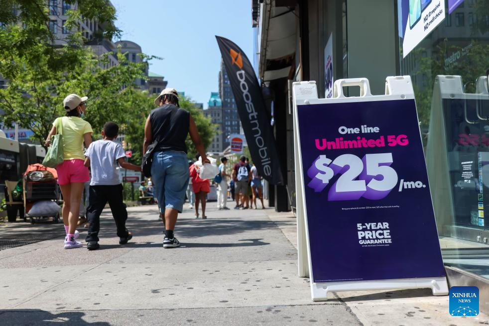 People walk past a mobile phone store in New York, the United States, on Aug. 12, 2025. The U.S. Consumer Price Index (CPI) increased 0.2 percent in July and 2.7 percent year-on-year, the U.S. Bureau of Labor Statistics (BLS) reported Tuesday. (Photo by Michael Nagle/Xinhua)
