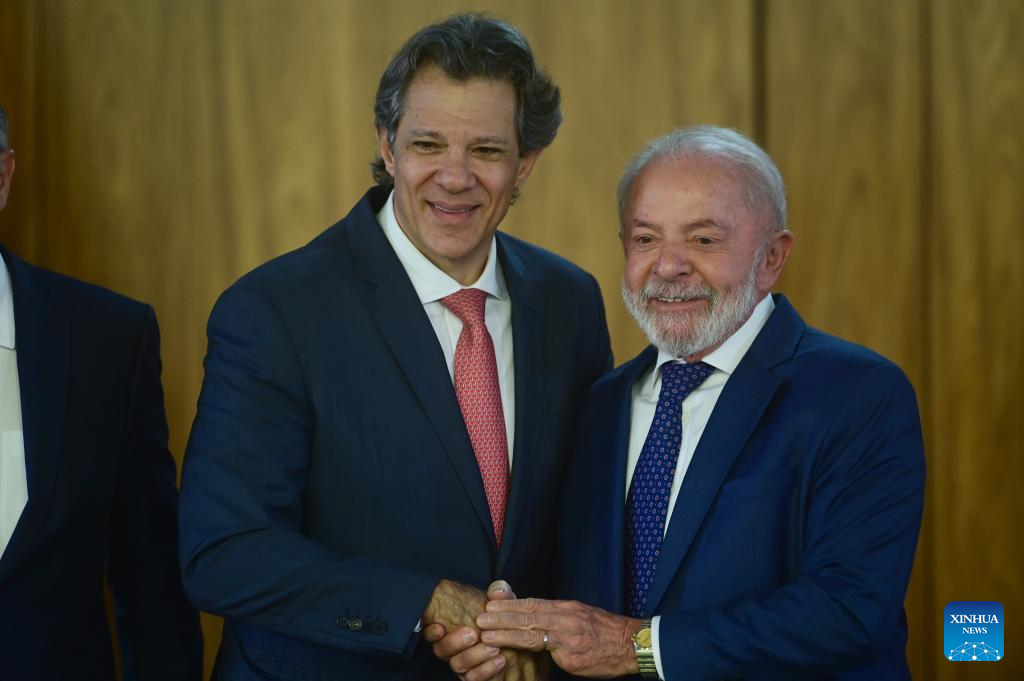 Brazilian President Luiz Inacio Lula da Silva (R) shakes hands with Brazilian Finance Minister Fernando Haddad at the launch ceremony of Sovereign Brazil initiative in Brasilia, Brazil, Aug. 13, 2025.