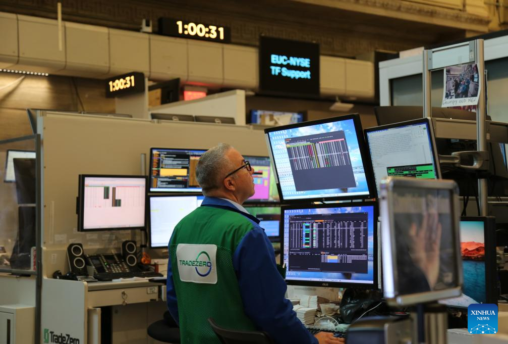 A trader works on the floor of the New York Stock Exchange in New York, the United States, on Aug. 14, 2025. U.S. stocks ended mixed on Thursday. (Xinhua/Liu Yanan)