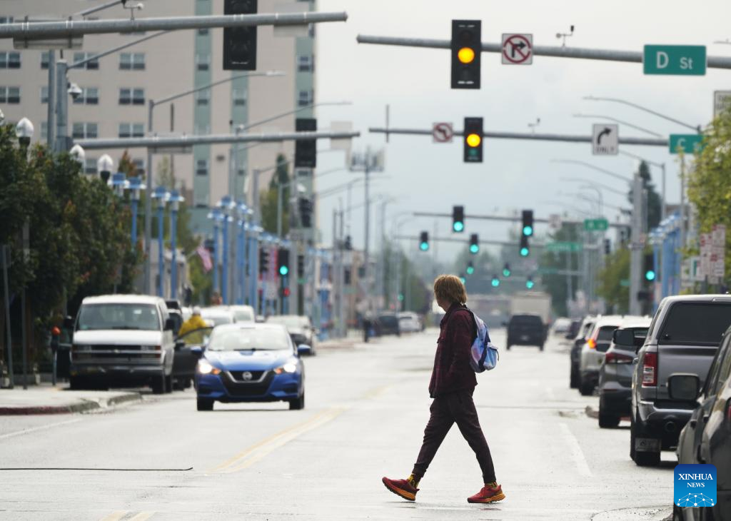 A man walks across a street in Anchorage, Alaska, the United States, on Aug. 14, 2025. The one-on-one meeting between Russian President Vladimir Putin and U.S. President Donald Trump is scheduled for Friday in Anchorage. (Xinhua/Wu Xiaoling)