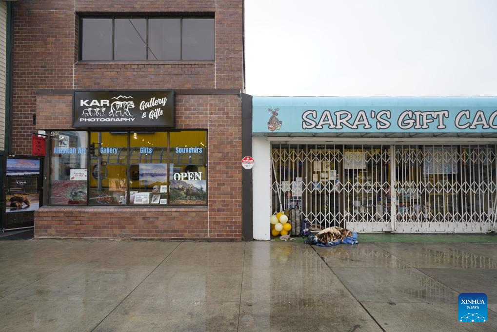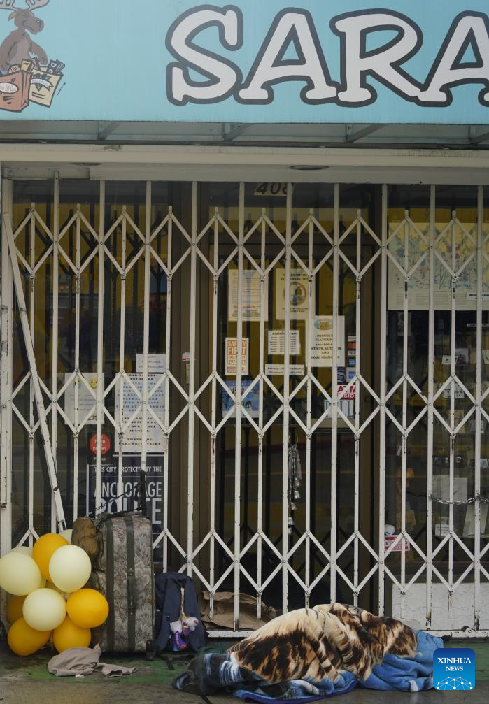 Photo taken on Aug. 14, 2025 shows a person sleeping in front of a store in Anchorage, Alaska, the United States. The one-on-one meeting between Russian President Vladimir Putin and U.S. President Donald Trump is scheduled for Friday in Anchorage. (Xinhua/Wu Xiaoling)