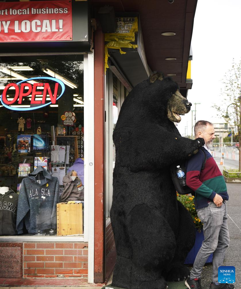 Photo taken on Aug. 14, 2025 shows a man posing for photos in front of a store in Anchorage, Alaska, the United States. The one-on-one meeting between Russian President Vladimir Putin and U.S. President Donald Trump is scheduled for Friday in Anchorage. (Xinhua/Wu Xiaoling)