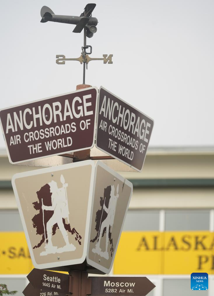 Photo taken on Aug. 14, 2025 shows signs in Anchorage, Alaska, the United States. The one-on-one meeting between Russian President Vladimir Putin and U.S. President Donald Trump is scheduled for Friday in Anchorage. (Xinhua/Wu Xiaoling)