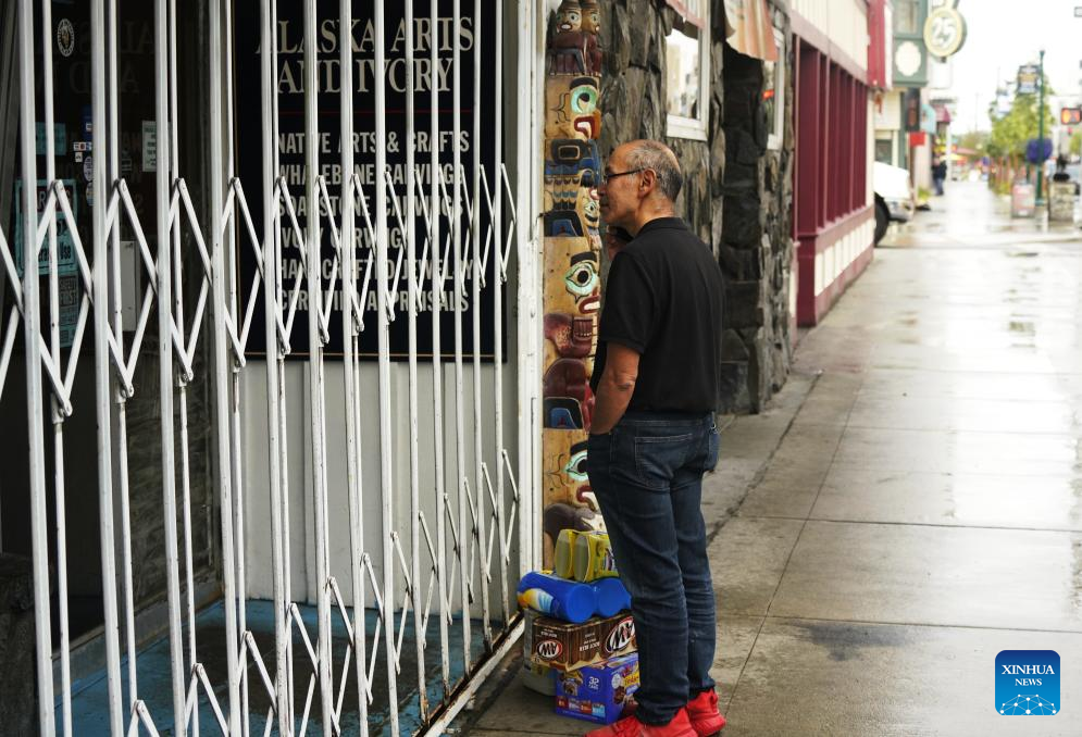 A man stands in front of a store in Anchorage, Alaska, the United States, on Aug. 14, 2025. The one-on-one meeting between Russian President Vladimir Putin and U.S. President Donald Trump is scheduled for Friday in Anchorage. (Xinhua/Wu Xiaoling)
