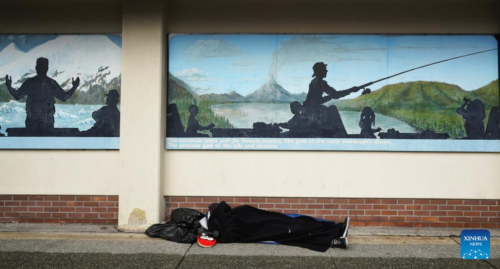 Photo taken on Aug. 14, 2025 shows a person sleeping by a street in Anchorage, Alaska, the United States. The one-on-one meeting between Russian President Vladimir Putin and U.S. President Donald Trump is scheduled for Friday in Anchorage. (Xinhua/Wu Xiaoling)
