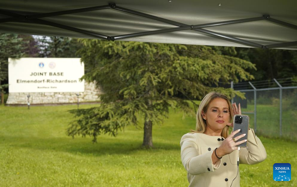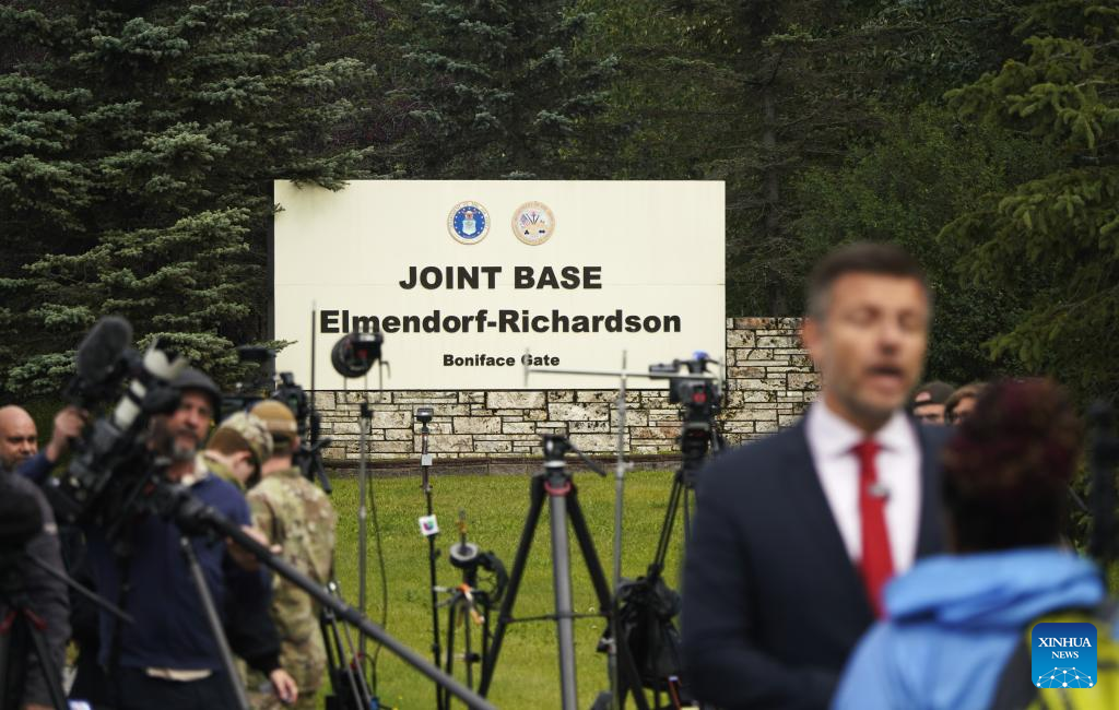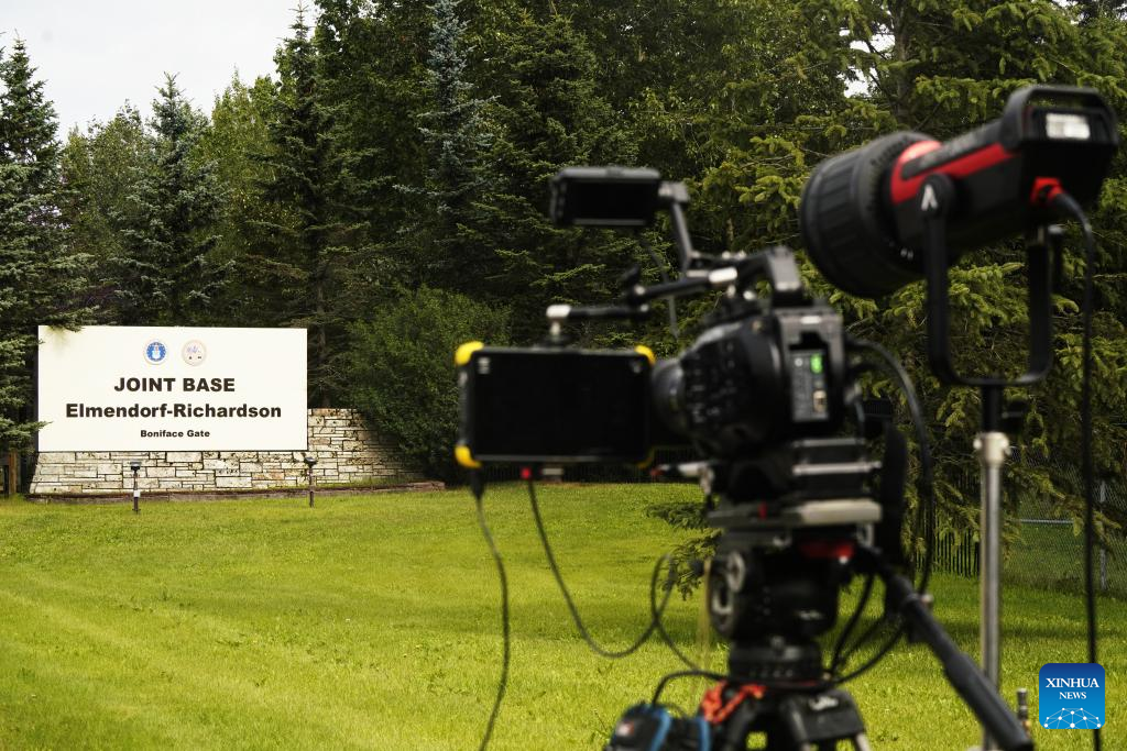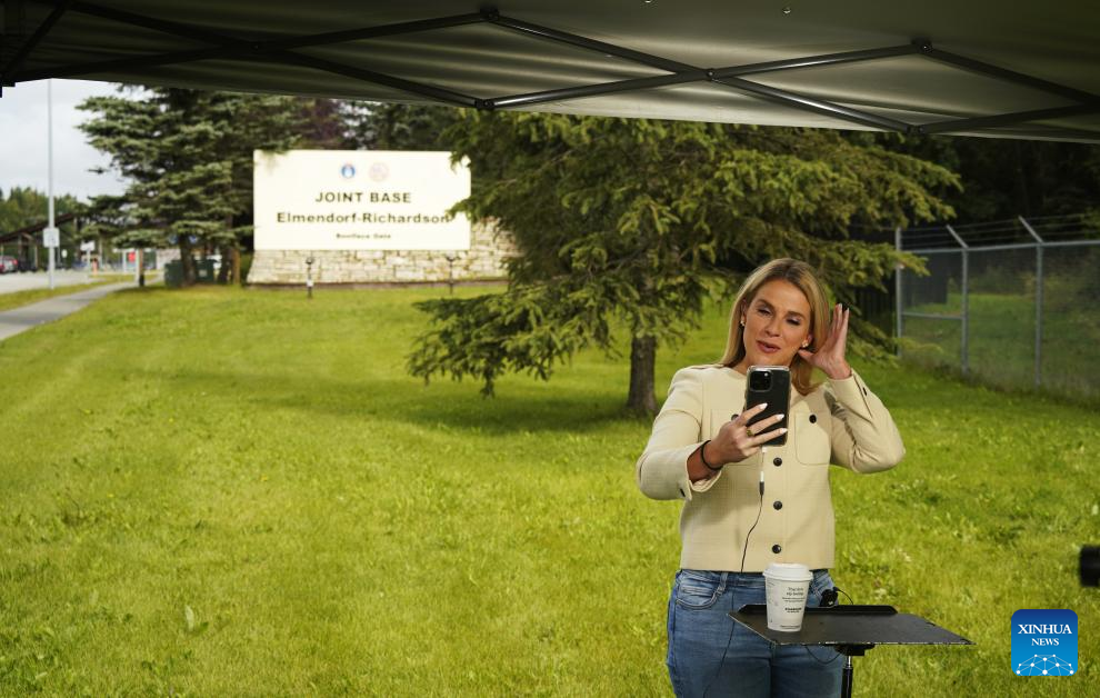 Journalists work in front of the sign of Joint Base Elmendorf-Richardson in Anchorage, Alaska, the United States, on Aug. 14, 2025. The one-on-one meeting between Russian President Vladimir Putin and U.S. President Donald Trump is scheduled for Friday in Anchorage. (Xinhua/Wu Xiaoling)