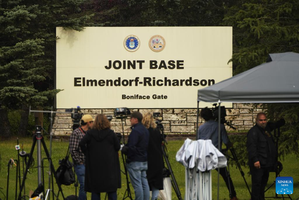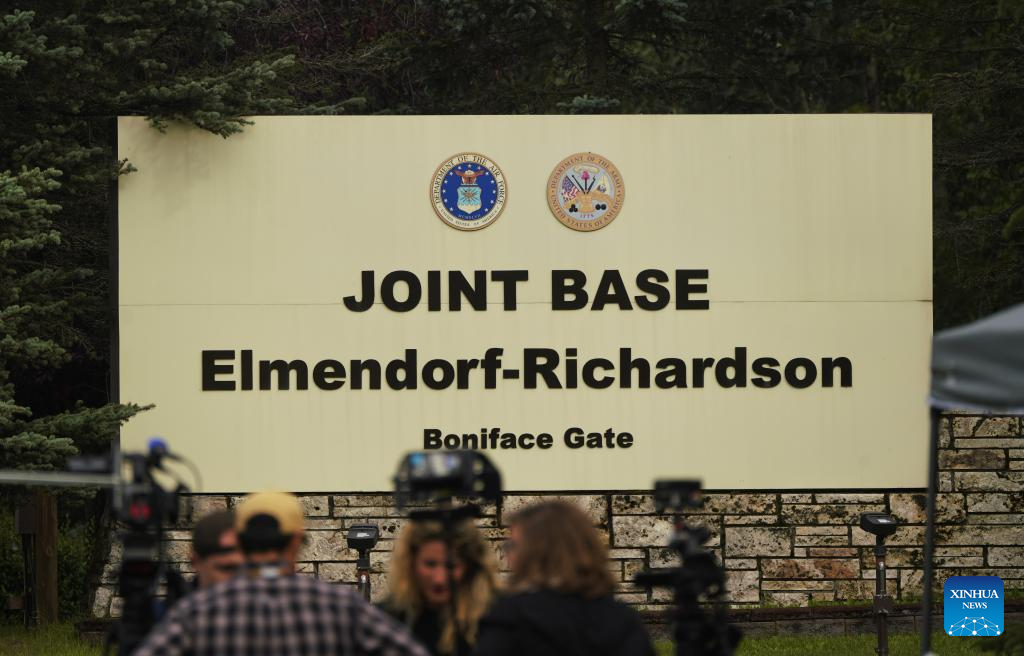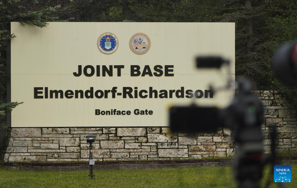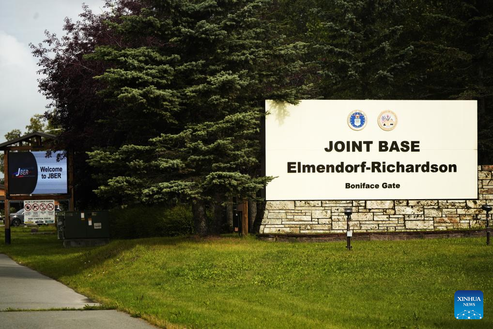 Photo taken on Aug. 14, 2025 shows the sign of Joint Base Elmendorf-Richardson in Anchorage, Alaska, the United States. The one-on-one meeting between Russian President Vladimir Putin and U.S. President Donald Trump is scheduled for Friday in Anchorage. (Xinhua/Wu Xiaoling)