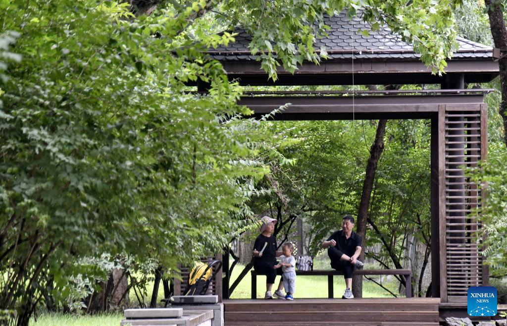 People enjoy leisure time at a park along the Grand Canal in Tongzhou District of Beijing, capital of China, Aug. 16, 2025. Connecting Beijing and Hangzhou in east China's Zhejiang Province, the Grand Canal is the world's longest artificial waterway.