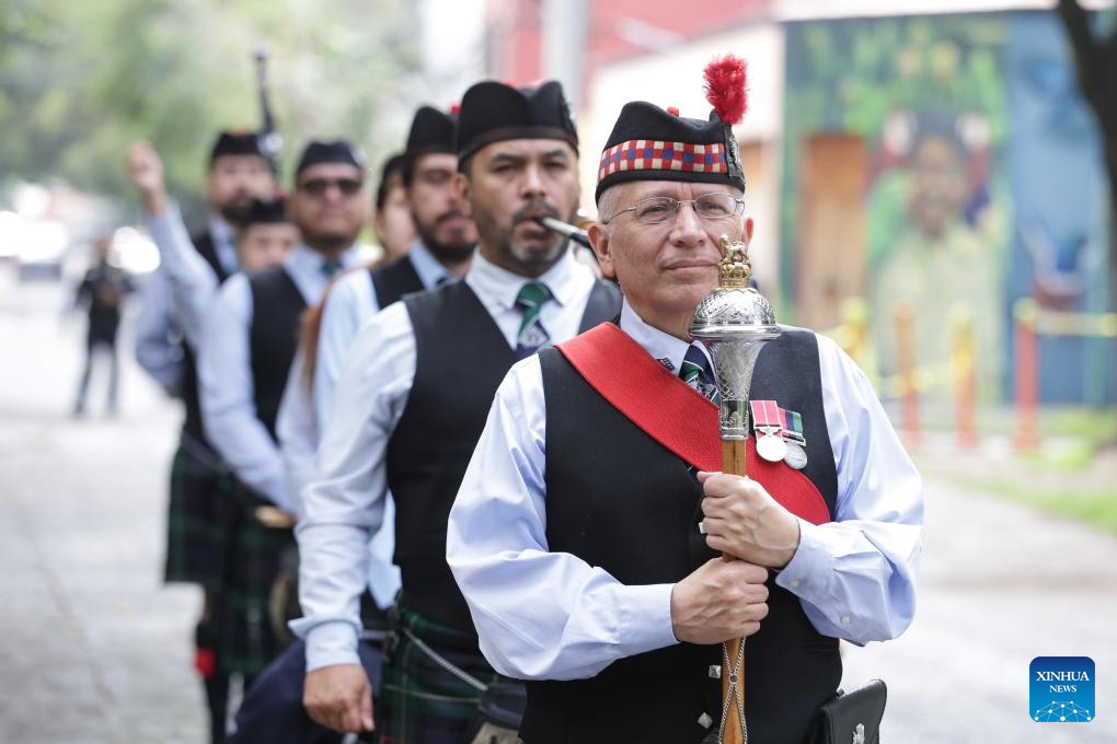 People dressed in traditional Irish costume attend a commemorative ceremony in Mexico City, Mexico, on Aug. 20, 2025. On the 178th anniversary of the Battle of Churubusco, a commemorative event was held in Mexico City on Wednesday to honor the heroes who defended the nation. On Aug. 20, 1847, Mexican forces fought to resist the advance of U.S. army at Churubusco during the Mexican-American War. (Photo by Francisco Canedo/Xinhua)