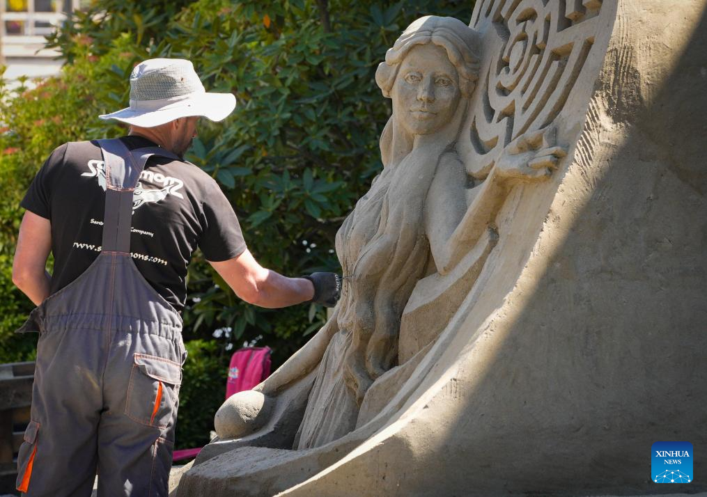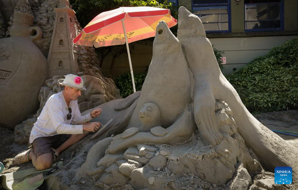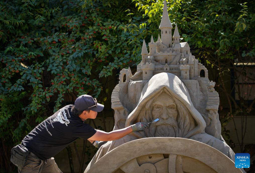 An artist works on a sand sculpture during the "Sands of Wonder" 2025 International Sand Sculpting Showcase at the annual Pacific National Exhibition (PNE) in Vancouver, British Columbia, Canada, Aug. 22, 2025. Artists who participated in the event began working on Aug. 17 and finished their sand artworks on Friday, giving fairgoers an opportunity to see large-scale sand sculptures taking shape. (Photo by Liang Sen/Xinhua)