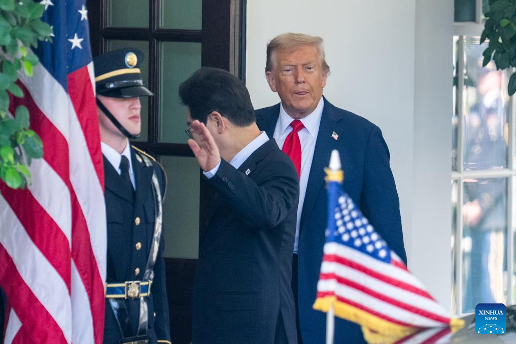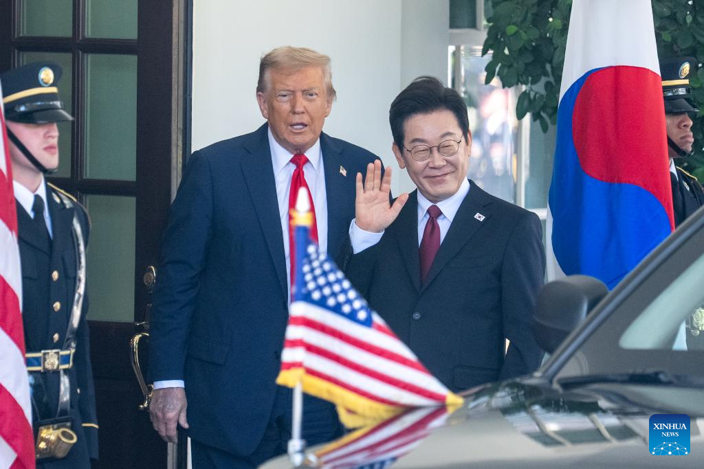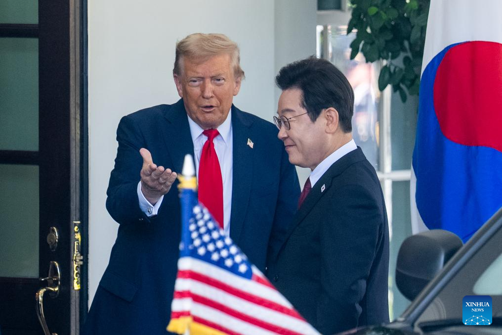 U.S. President Donald Trump (R) welcomes visiting South Korean President Lee Jae-myung (C) at the White House in Washington, D.C., the United States, on Aug. 25, 2025. (Xinhua/Hu Yousong)