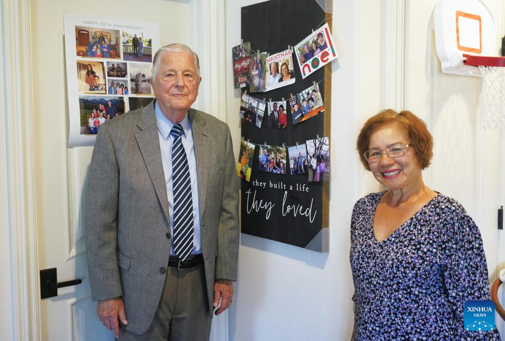 Stilwell's grandson John Easterbrook (L) and his wife pose for a photo in an interview with Xinhua News Agency at home in Saratoga of San Francisco Bay Area, the United States, on Aug. 11, 2025.(Xinhua/Wu Xiaoling)
