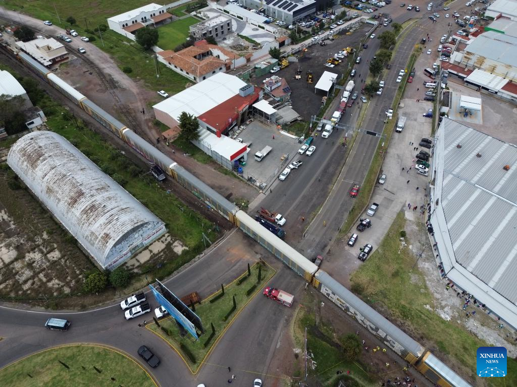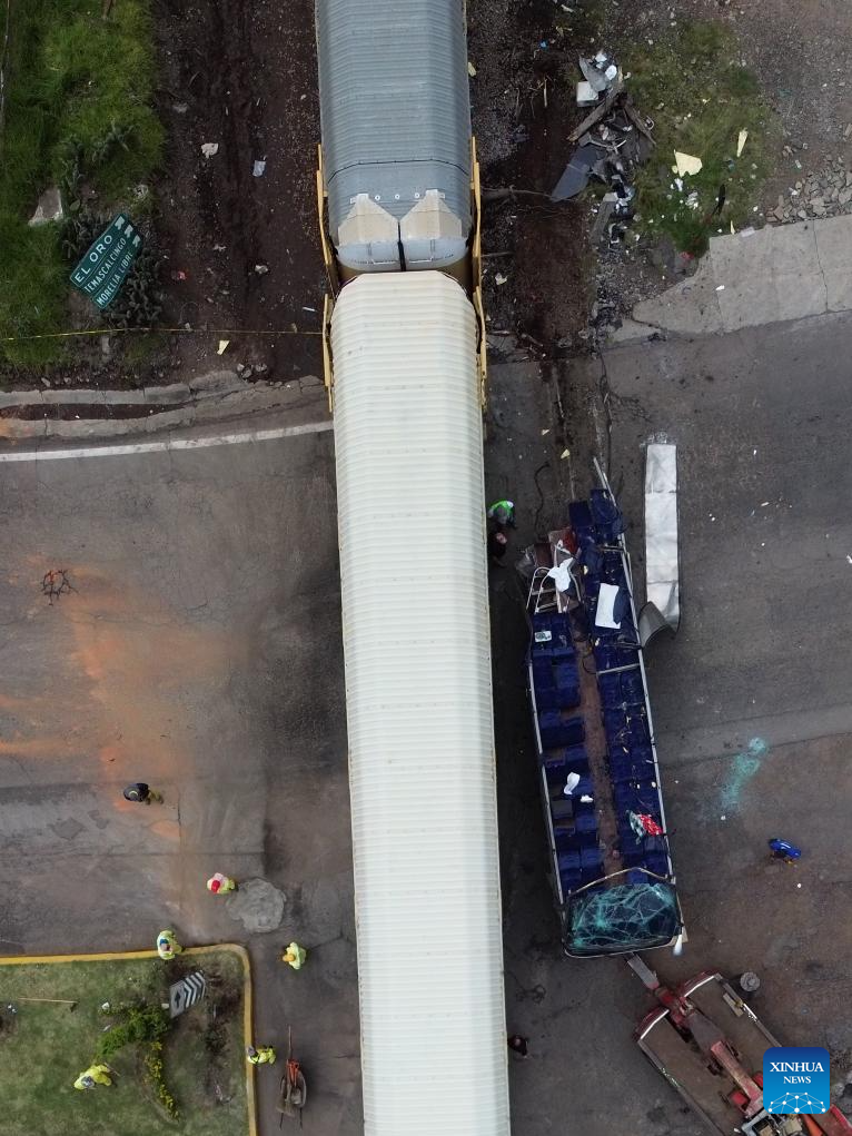 This aerial drone photo taken on Sept. 8, 2025 shows the accident site in the Atlacomulco municipality, the State of Mexico, Mexico. At least 10 people were killed and over 40 others injured when a double-deck passenger bus was hit by a freight train in central Mexico on Monday, authorities said. (Photo by Francisco Canedo/Xinhua)