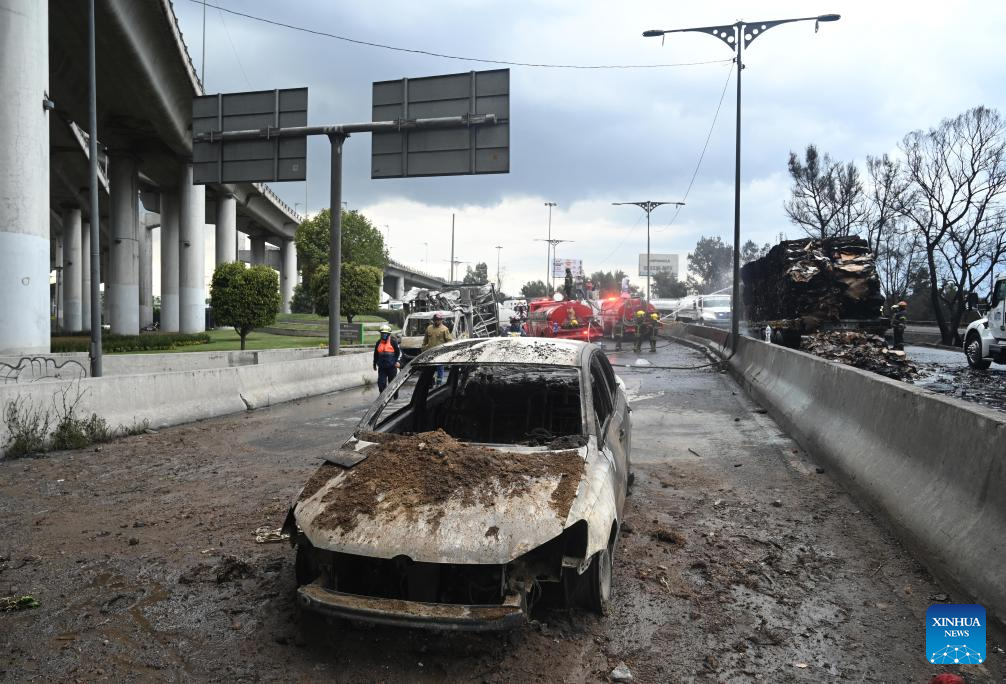 Photo taken on Sept. 10, 2025 shows the gas tanker truck explosion accident site in Mexico City, Mexico. Fifty-seven people were injured after a gas tanker truck exploded on Wednesday in Mexico City, with 19 of them in serious condition, local authorities said. (Str/Xinhua)