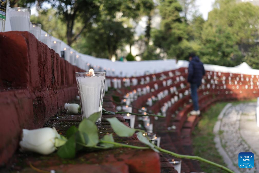 Candles are lit on during an event commemorating the 40th anniversary of the 1985 Mexico earthquake, in Mexico City, Mexico, on Sept. 19, 2025. On Sept. 19, 1985, an 8.1-magnitude earthquake hit Mexico, destroying one third of the buildings in the central area of Mexico City and claiming thousands of lives. (Photo by Francisco Canedo/Xinhua)