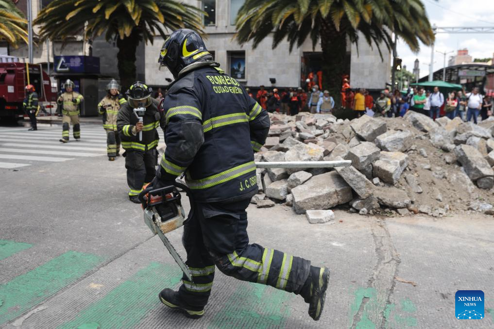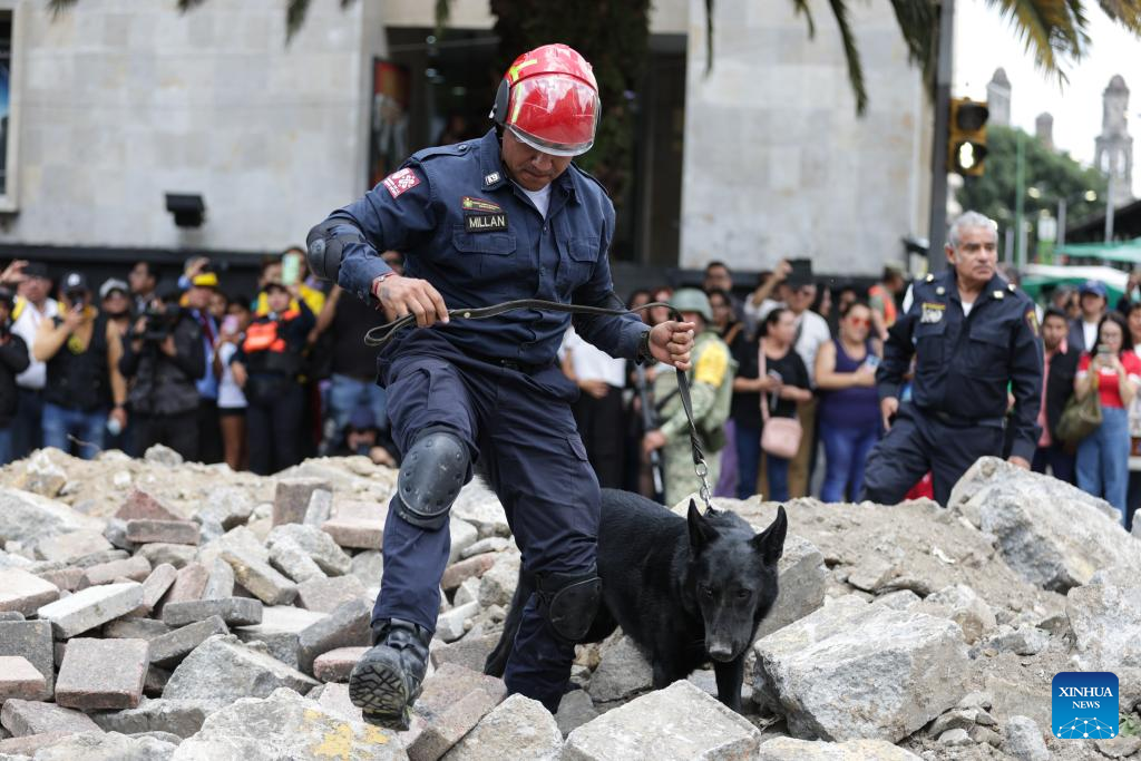 Rescuers work during a nationwide earthquake drill commemorating the 40th anniversary of the 1985 Mexico earthquake, in Mexico City, Mexico, on Sept. 19, 2025. On Sept. 19, 1985, an 8.1-magnitude earthquake hit Mexico, destroying one third of the buildings in the central area of Mexico City and claiming thousands of lives. (Photo by Francisco Canedo/Xinhua)