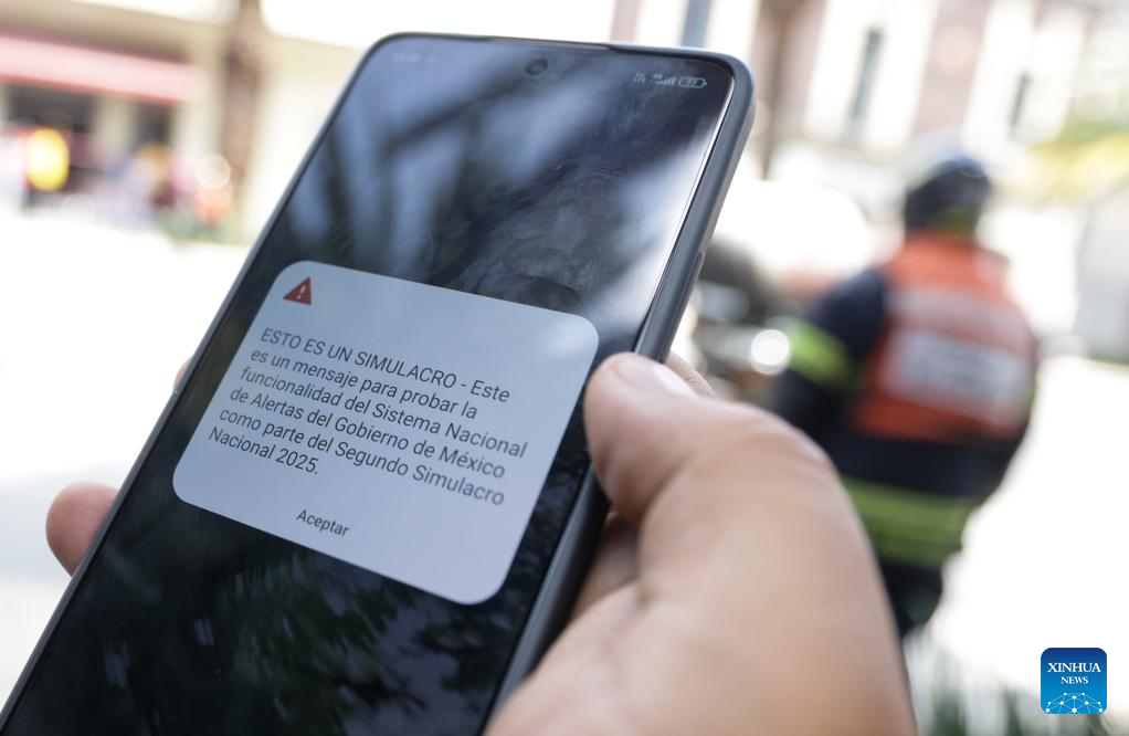 People receives an earthquake alert message during a nationwide earthquake drill commemorating the 40th anniversary of the 1985 Mexico earthquake, in Mexico City, Mexico, on Sept. 19, 2025. On Sept. 19, 1985, an 8.1-magnitude earthquake hit Mexico, destroying one third of the buildings in the central area of Mexico City and claiming thousands of lives. (Photo by Francisco Canedo/Xinhua)