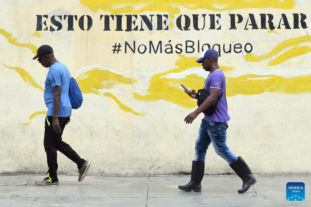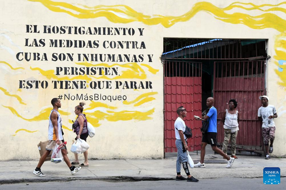 Pedestrians walk past a wall painting condemning the U.S. economic blockade against Cuba, in Havana, capital of Cuba, Sept. 22, 2025. (Photo by Joaquín Hernández/Xinhua)