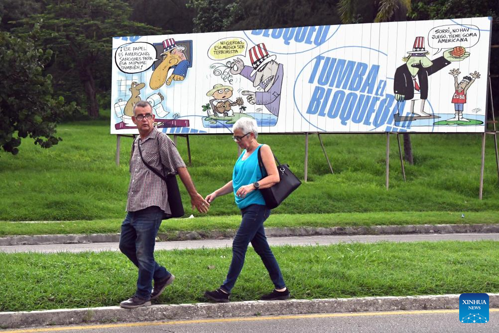 Pedestrians walk past a billboard bearing cartoons that condemn the U.S. economic blockade against Cuba, in Havana, capital of Cuba, Sept. 22, 2025. (Photo by Joaquín Hernández/Xinhua)