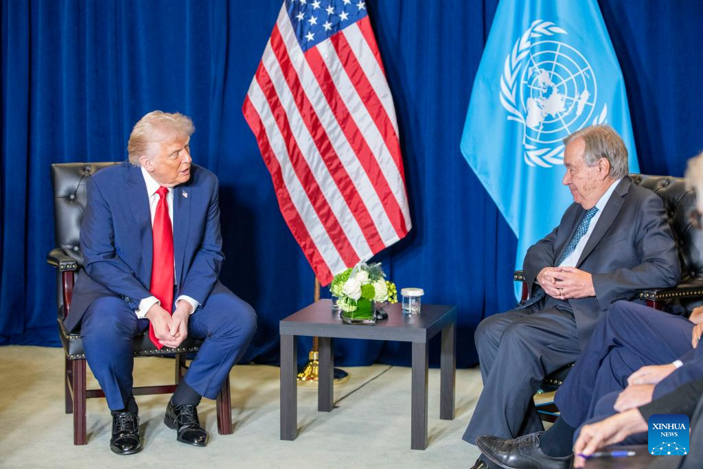 UN Secretary-General Antonio Guterres (R) meets with U.S. President Donald Trump at the UN headquarters in New York, Sept. 23, 2025. (Xinhua/Xie E)