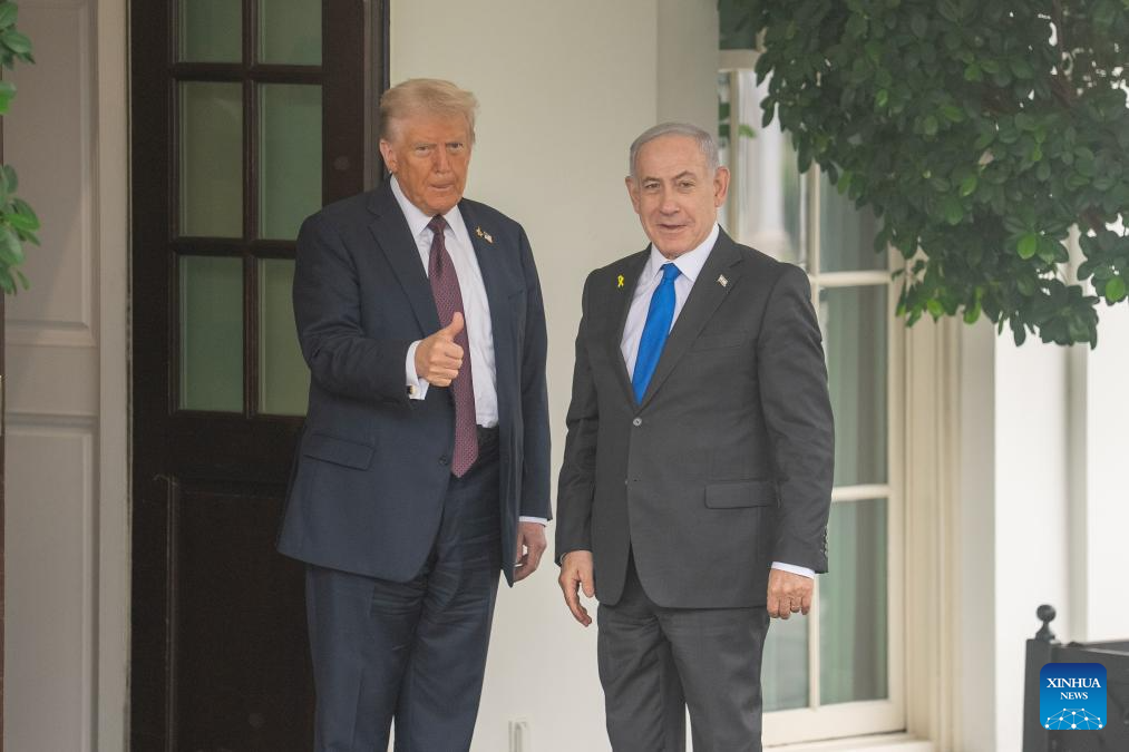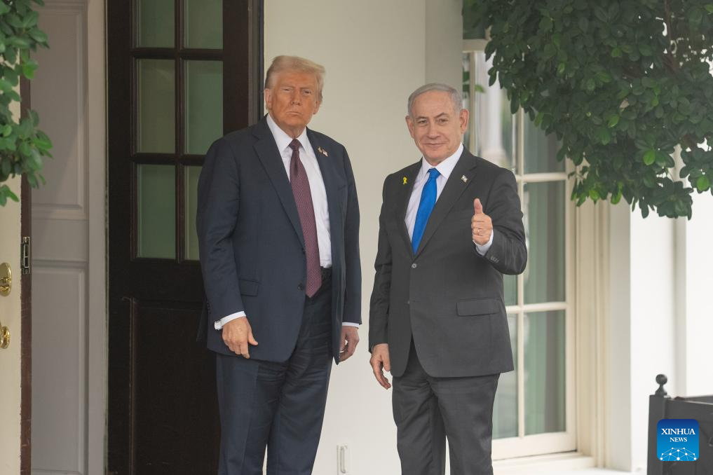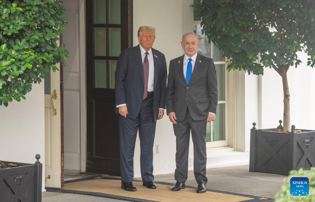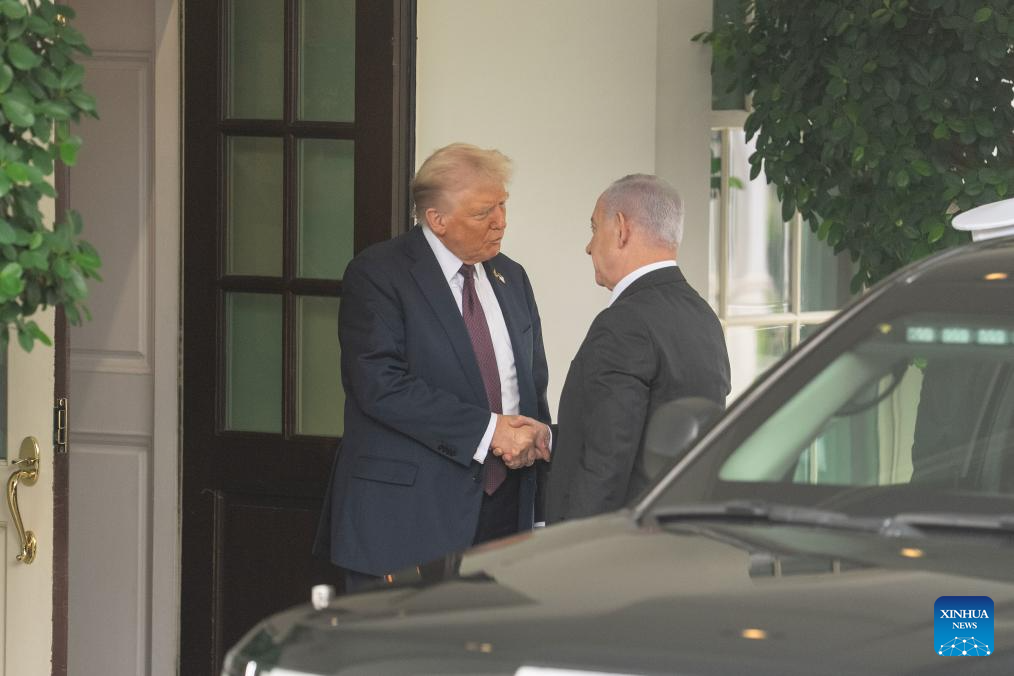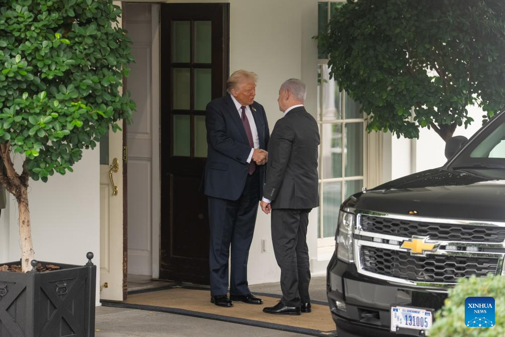 U.S. President Donald Trump (L) welcomes Israeli Prime Minister Benjamin Netanyahu at the White House in Washington, D.C., the United States, on Sept. 29, 2025. (Xinhua/Hu Yousong)