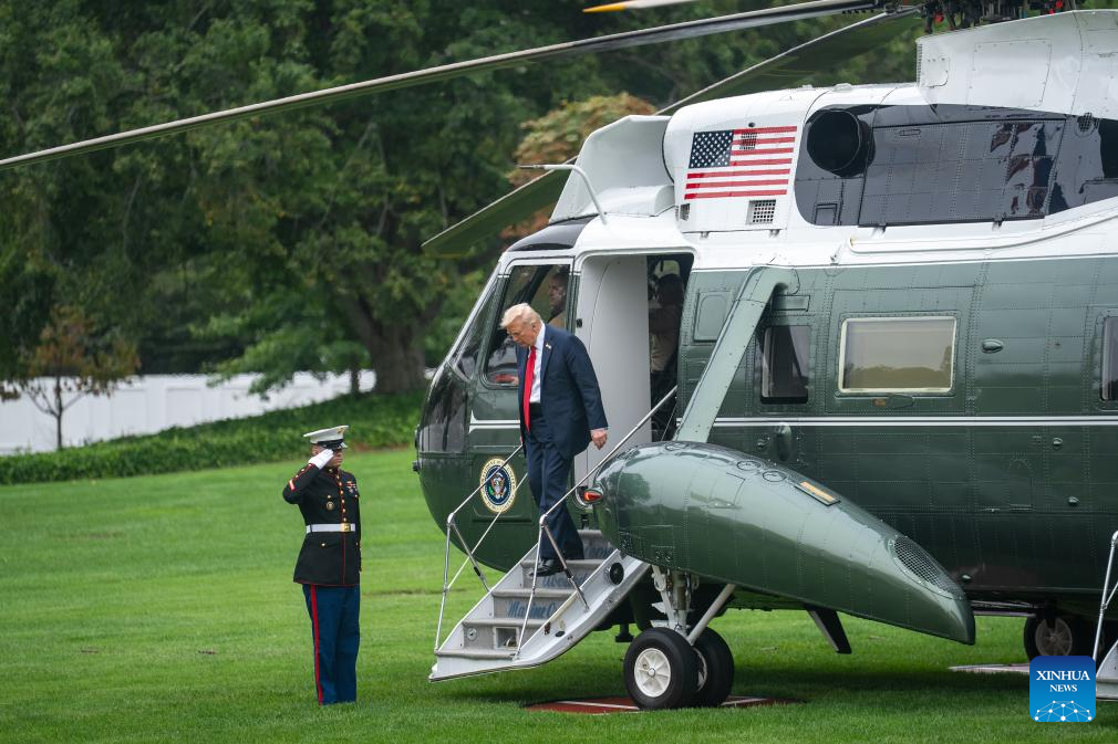 U.S. President Donald Trump steps off Marine One upon his arrival at the White House in Washington, D.C., the United States, Sept. 30, 2025. Trump said on Tuesday the White House is weighing actions to crack down on drug cartels "coming by land" from Venezuela. (Xinhua/Hu Yousong)