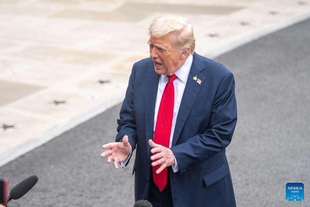 U.S. President Donald Trump speaks to reporters at the White House in Washington, D.C., the United States, Sept. 30, 2025. Trump said on Tuesday the White House is weighing actions to crack down on drug cartels "coming by land" from Venezuela. (Xinhua/Hu Yousong)