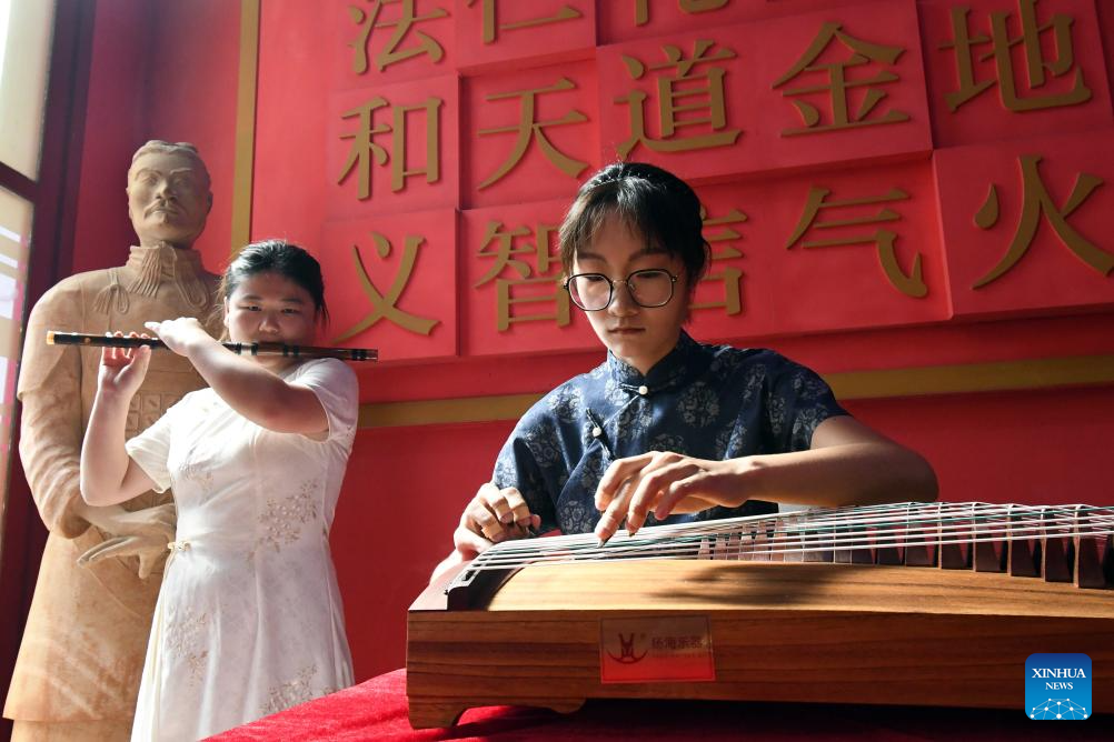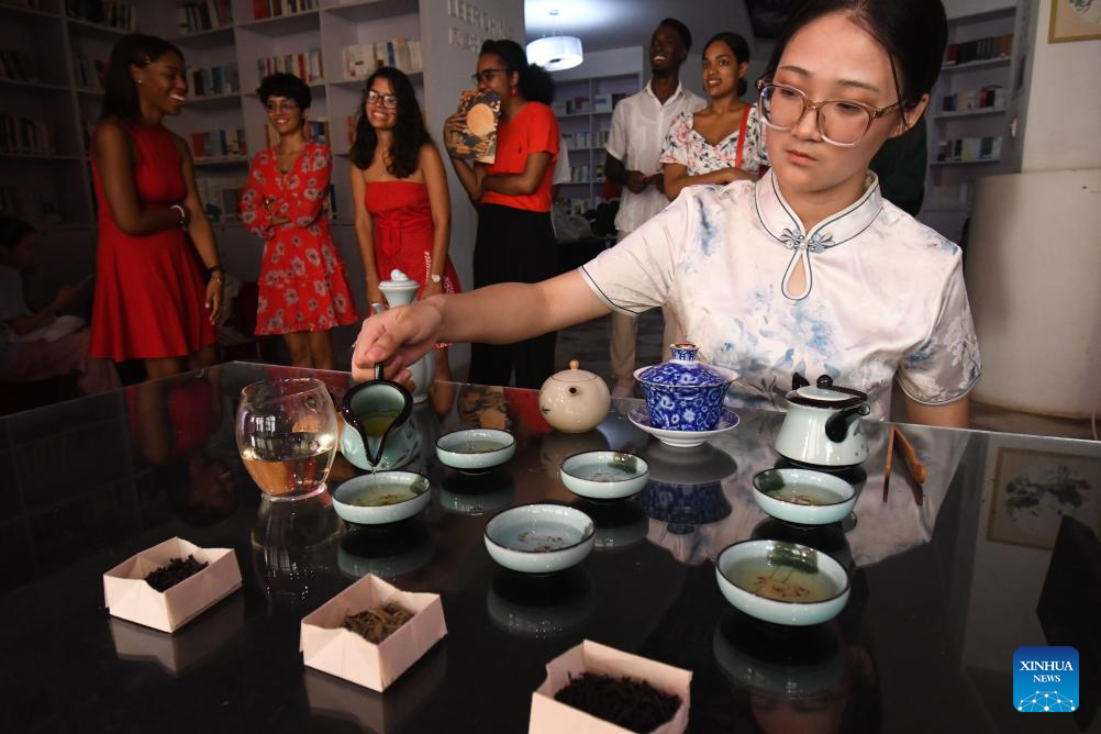 A Cuban student (1st, L) and a Chinese teacher (2nd, L) from the Confucius Institute at the University of Havana perform during a cultural event "Tea for Harmony: Yaji Cultural Salon" in Havana, capital of Cuba, Sept. 30, 2025. (Photo by Joaquin Hernandez/Xinhua)