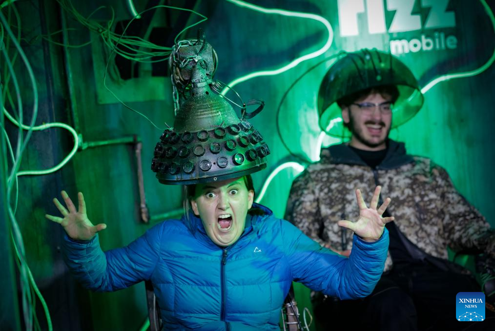 Visitors pose for photos at a Halloween-themed booth during the Fright Nights 2025 event at Pacific National Exhibition's Playland in Vancouver, British Columbia, Canada, Oct. 3, 2025. The annual Halloween event Fright Nights kicked off here on Friday, featuring seven haunted houses, live shows and more than 15 amusement rides. It will run until Oct. 31. (Photo by Liang Sen/Xinhua)