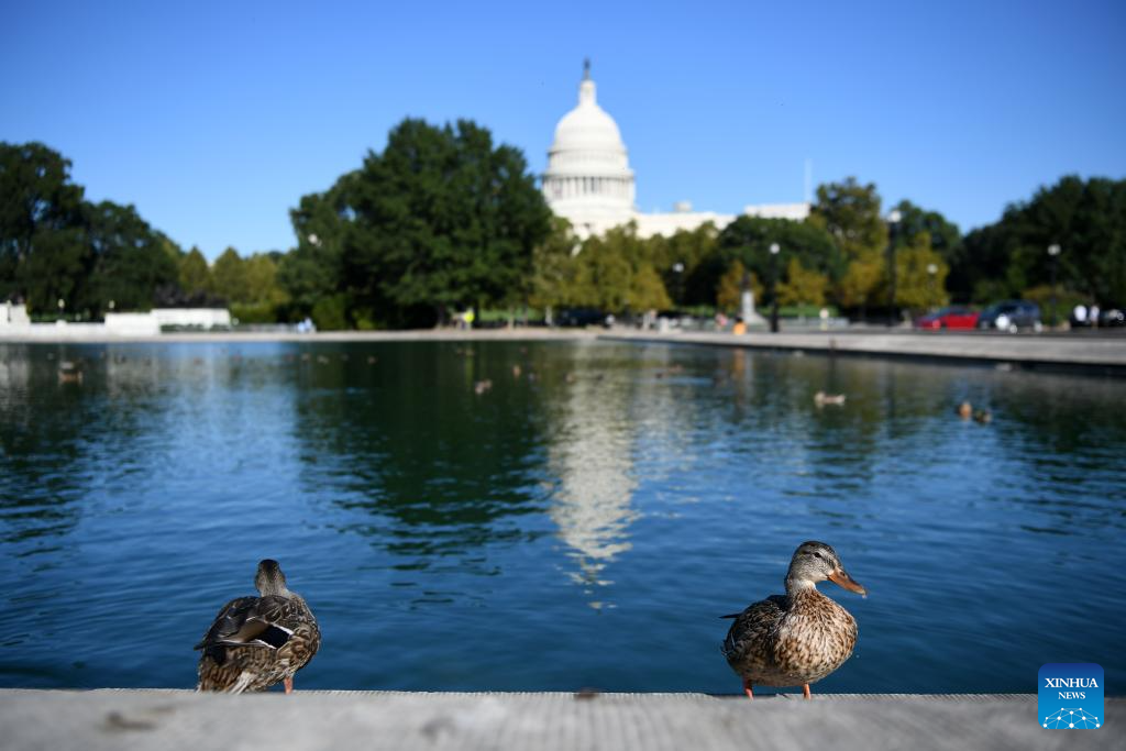 Ducks bask in the sun with the U.S. Capitol building in the background in Washington, D.C., the United States, Oct. 5, 2025. As the U.S. federal government entered a shutdown -- the first time in nearly seven years -- the confrontation between President Donald Trump's administration and the Democratic Party has further escalated.