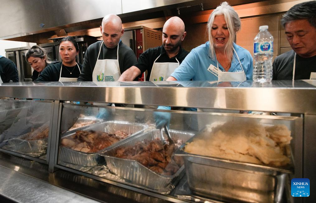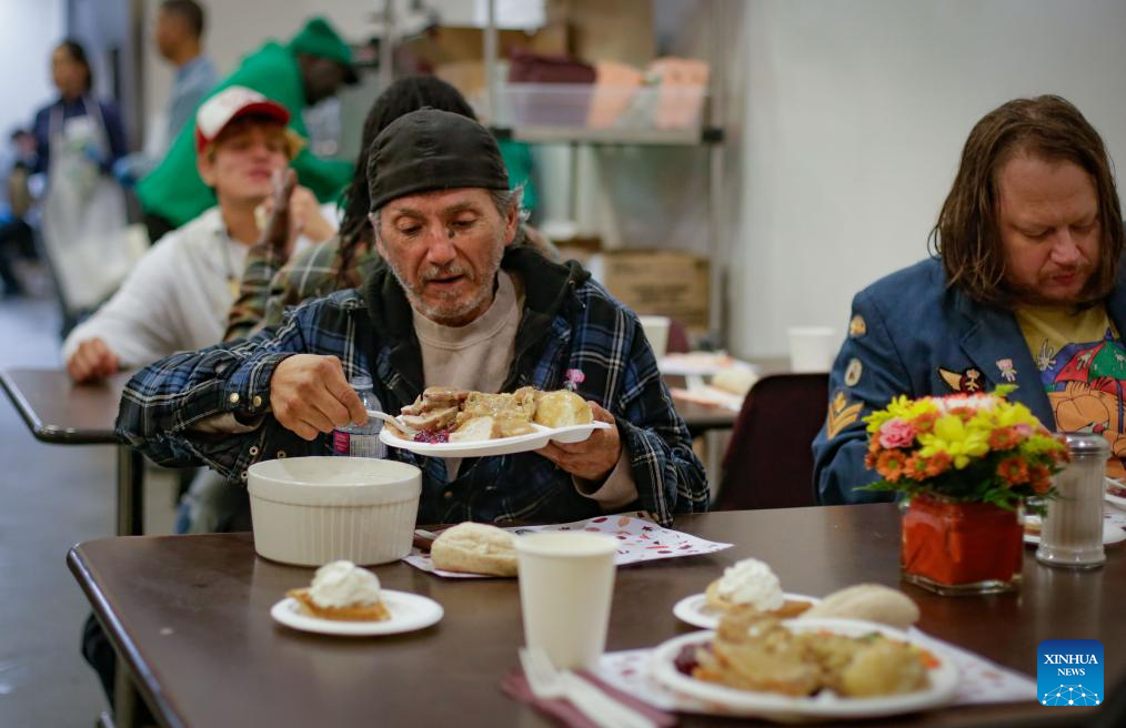 The local charity served about 2,000 free meals on Friday to the local residents suffering from unemployment, rising living costs and a lack of affordable housing as part of an early Thanksgiving celebration. Canada's Thanksgiving Day falls on Oct. 13 this year. (Photo by Liang Sen/Xinhua)