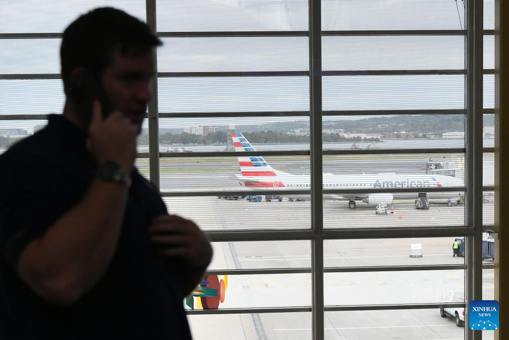 A man makes a phone call at Ronald Reagan Washington National Airport in Arlington, Virginia, the United States, on Oct. 10, 2025. The U.S. federal government shutdown has led to flight delays, as essential employees such as air traffic controllers and Transportation Security Administration (TSA) officers are working without pay. That has led to staff shortages. (Xinhua/Li Rui)