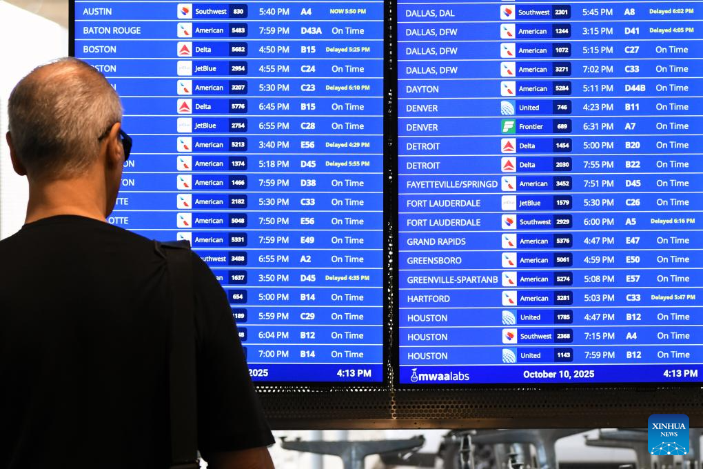 A man checks on a flight information display board at Ronald Reagan Washington National Airport in Arlington, Virginia, the United States, on Oct. 10, 2025. The U.S. federal government shutdown has led to flight delays, as essential employees such as air traffic controllers and Transportation Security Administration (TSA) officers are working without pay. That has led to staff shortages. (Xinhua/Li Rui)