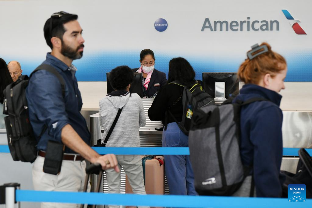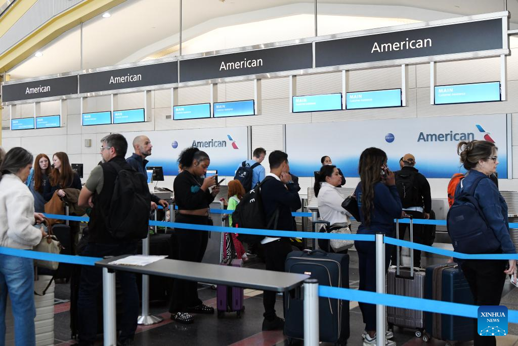 Passengers check in at an American Airlines' counter at Ronald Reagan Washington National Airport in Arlington, Virginia, the United States, on Oct. 10, 2025. The U.S. federal government shutdown has led to flight delays, as essential employees such as air traffic controllers and Transportation Security Administration (TSA) officers are working without pay. That has led to staff shortages. (Xinhua/Li Rui)