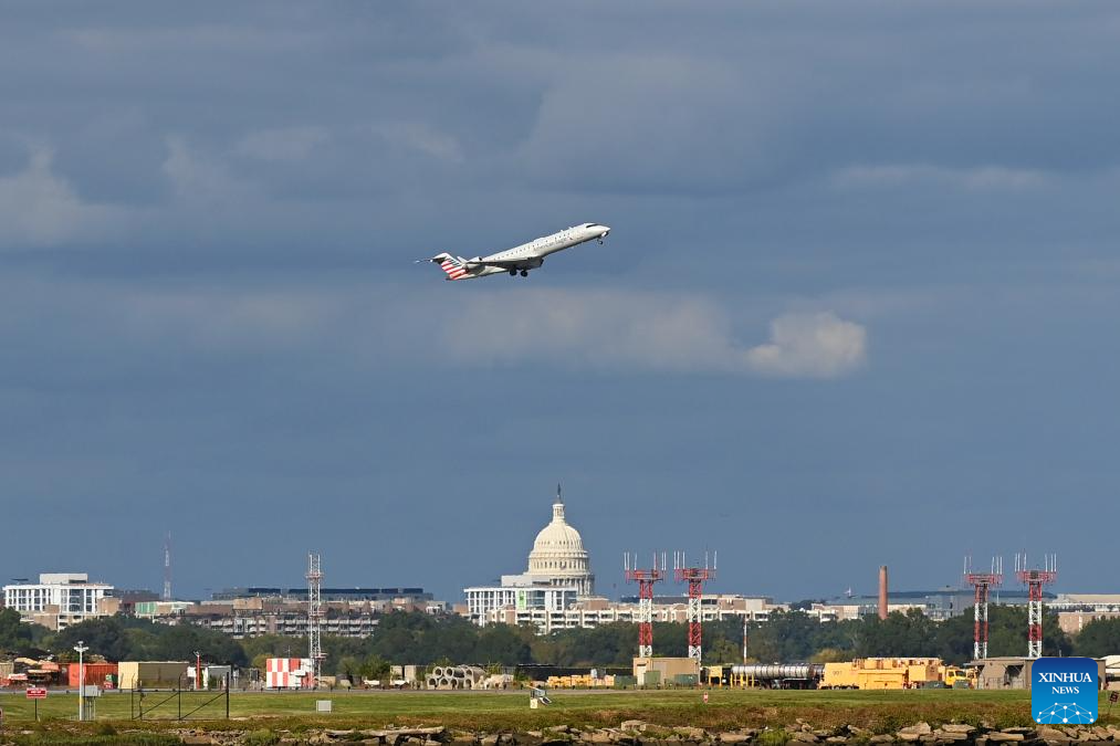 A plane takes off from Ronald Reagan Washington National Airport in Arlington, Virginia, the United States, on Oct. 10, 2025. The U.S. federal government shutdown has led to flight delays, as essential employees such as air traffic controllers and Transportation Security Administration (TSA) officers are working without pay. That has led to staff shortages. (Xinhua/Li Rui)